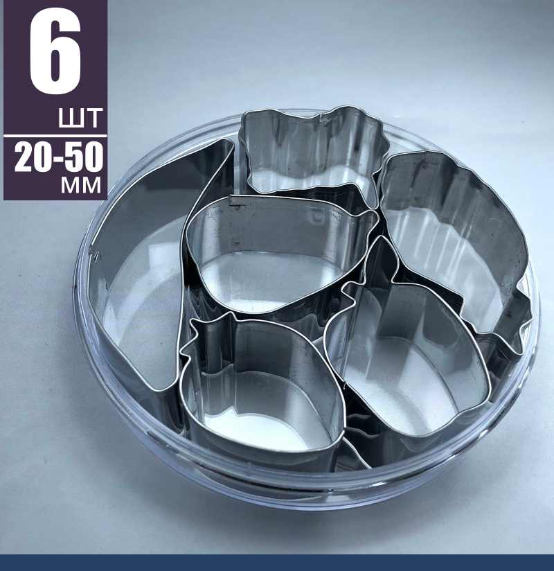 Вырубки для печенья, пряников, шоколада, мастики, марципана или теста набор из 6 шт в форме фруктов размером от 20 до 50 мм, высота 20 мм. Этот набор станет вашим надёжный кулинарным помощником. Универсальный набор вырубок, формы имеют широкий спектр применения их легко купить в нашем интернет-магазине.