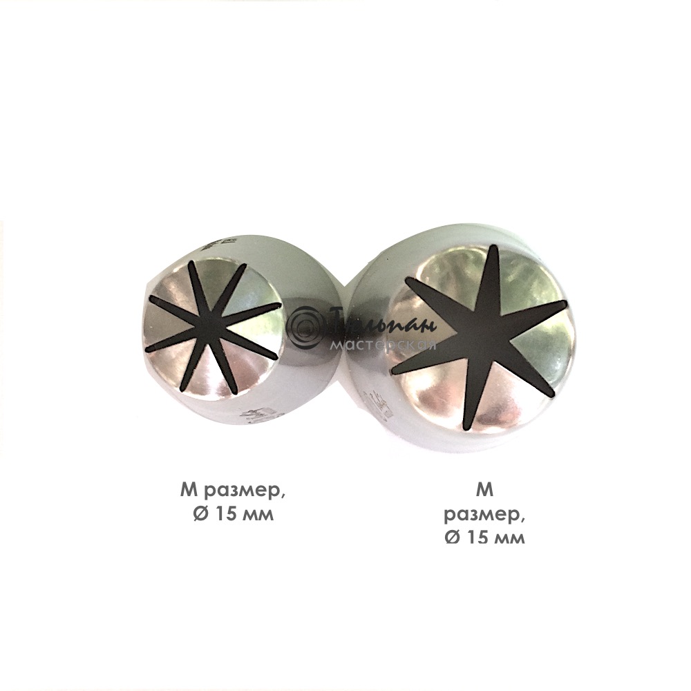 Подходит для использования со средним переходником. По размеру относятся к типовым насадкам размера L от Мастерской Тюльпан. Высота насадки 40 мм, верхний диаметр 15 мм.