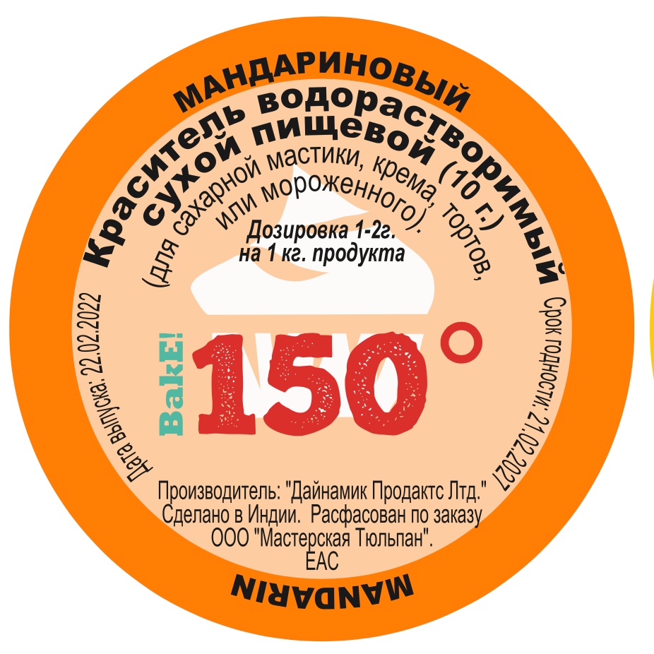 Краситель пищевой сухой водорастворимый МАНДАРИНОВЫЙ 150º Bake!™ - купить в Мастерской Тюльпан. Гарантия качества. Быстрая доставка. Дозировка 1 - 2 г. на 1 кг. продукта. Скидка на первый заказ и постоянным покупателям 5%. Ищите промокод для скидки на нашем сайте.